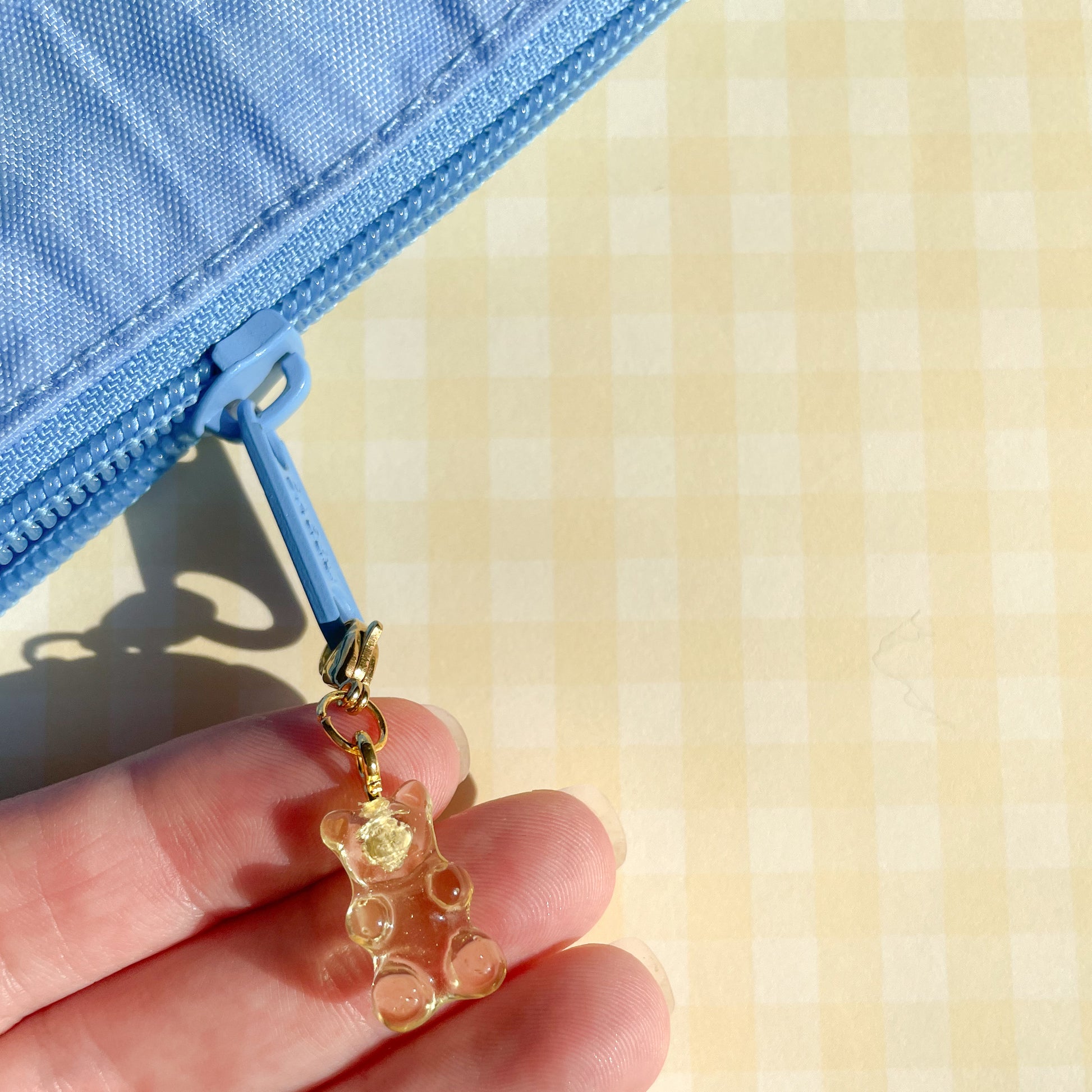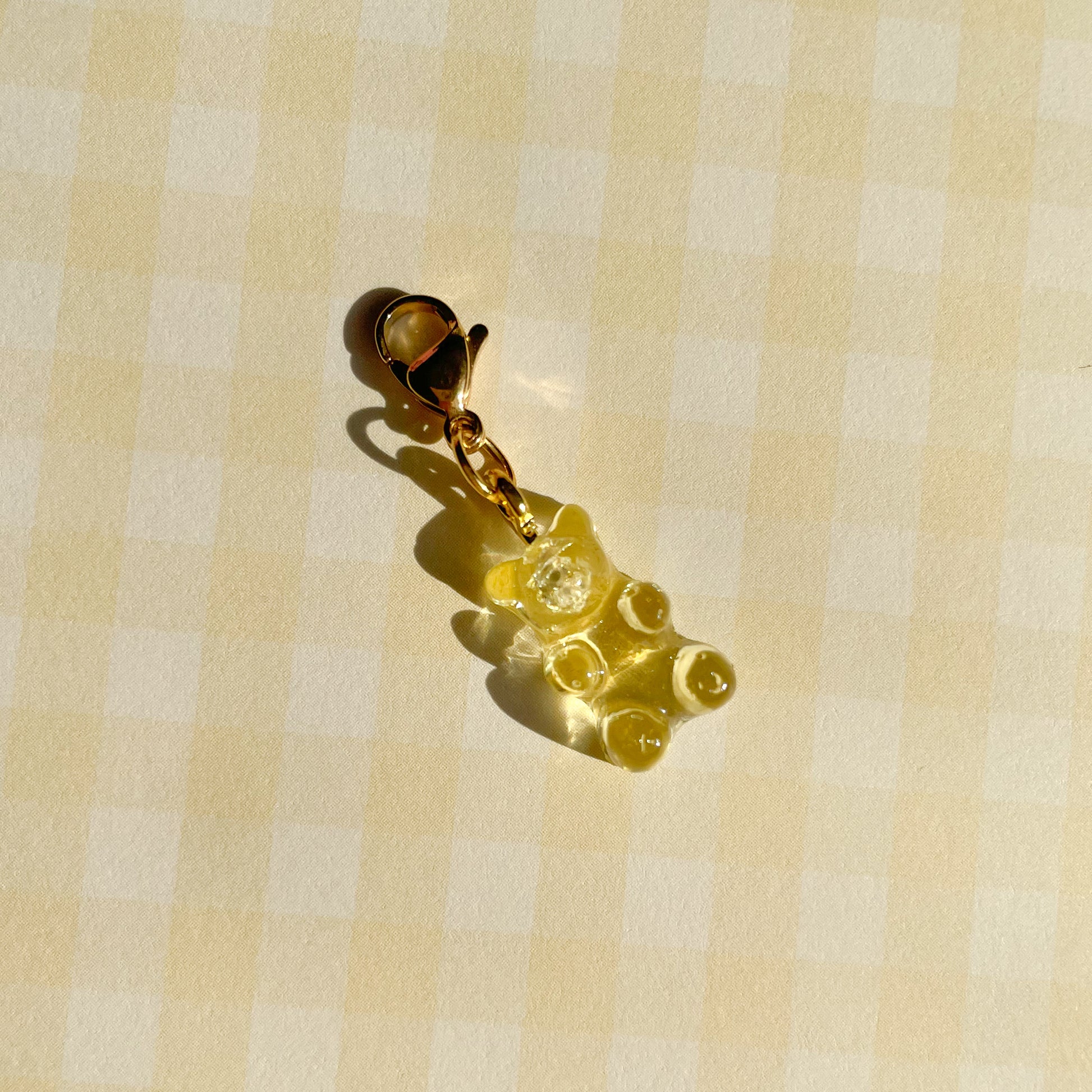 Yellow pineapple gummy bear bag charm made with resin and stainless steel hardware. Gummy bear measures 0.75” by 0.5”